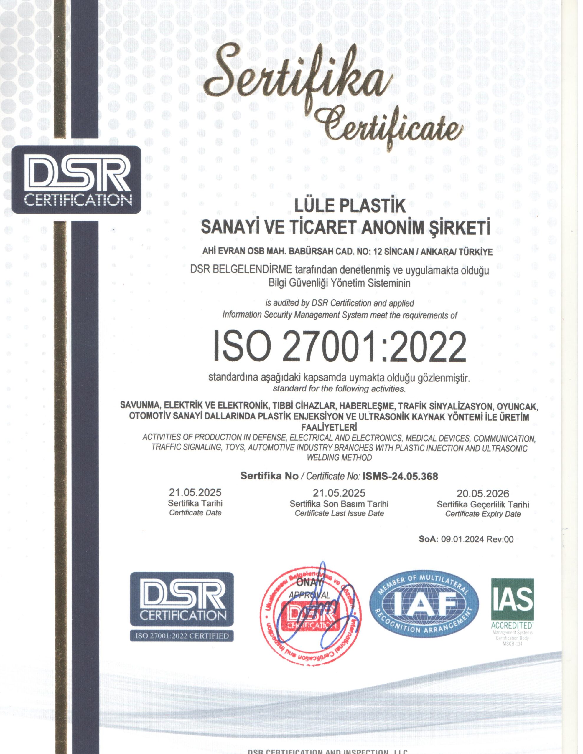 Lüle Plastik olarak, üretim süreçlerimizin her aşamasında uluslararası standartları rehber ediniyoruz. Yarım asrı aşkın tecrübemizi; kalite, çevre, bilgi güvenliği ve iş sağlığı alanındaki global sertifikalarımızla taçlandırarak, müşterilerimize sürdürülebilir ve güvenilir çözümler sunuyoruz.